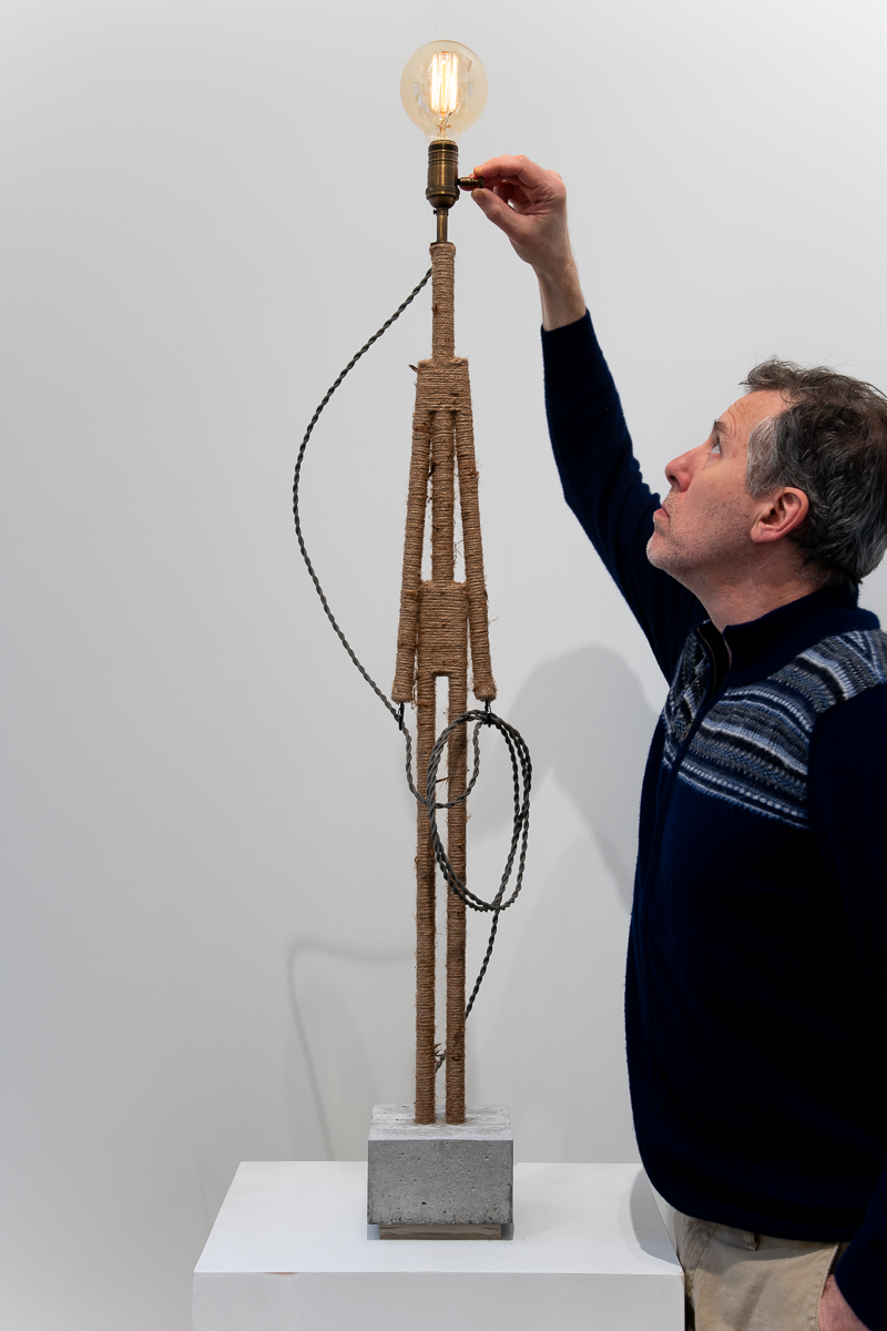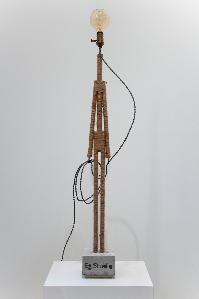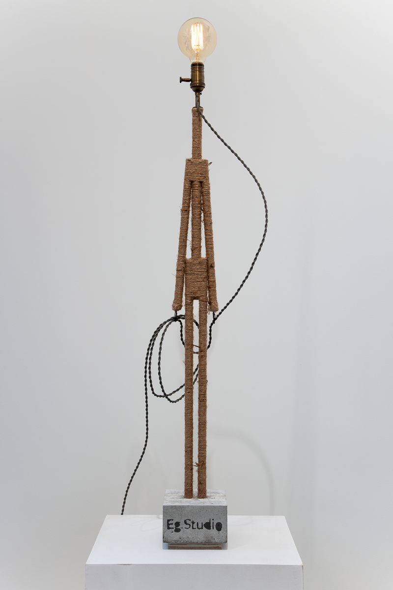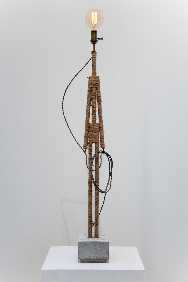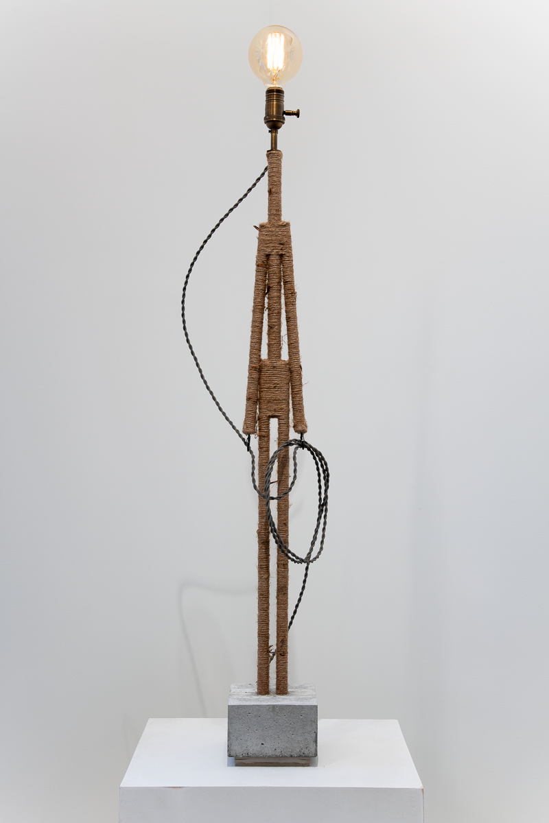 Materials:  wood, jute, glue, concrete, felt, twisted SPT-1 cloth-covered lamp cord, antiqued brass electrical components, dimmer electronics and a “squirrel cage” G30 Edison bulb.