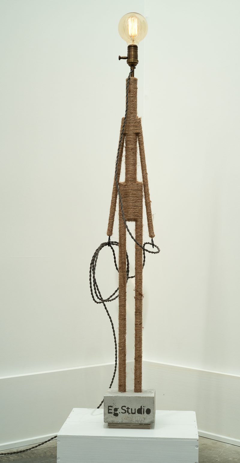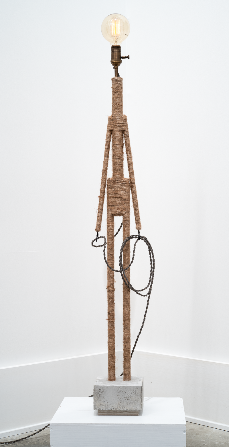 Materials: wood, jute, glue, concrete, felt, twisted SPT-1 cloth-covered lamp cord, antiqued brass electrical components, dimmer electronics and a “squirrel cage” G30 Edison bulb.
