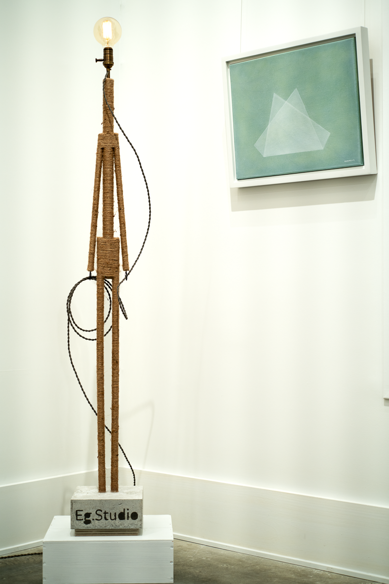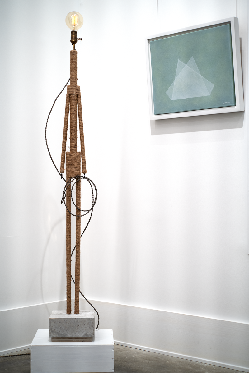 Materials: wood, jute, glue, concrete, felt, twisted SPT-1 cloth-covered lamp cord, antiqued brass electrical components, dimmer electronics and a “squirrel cage” G30 Edison bulb.