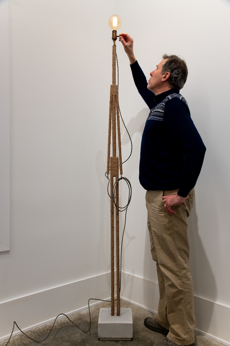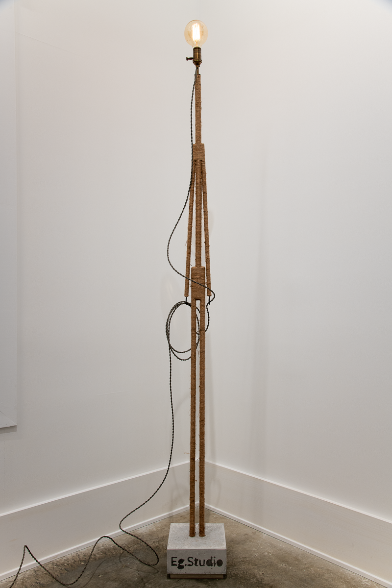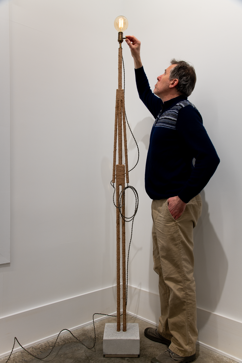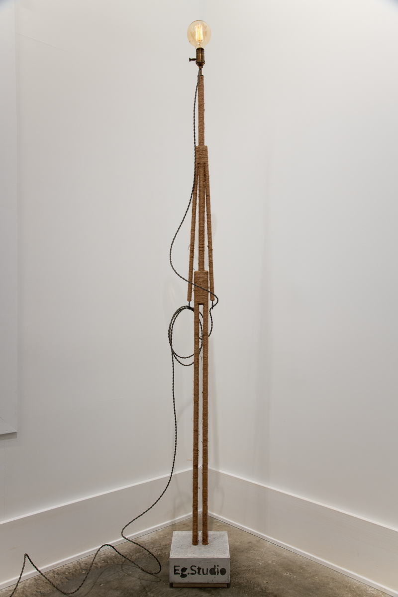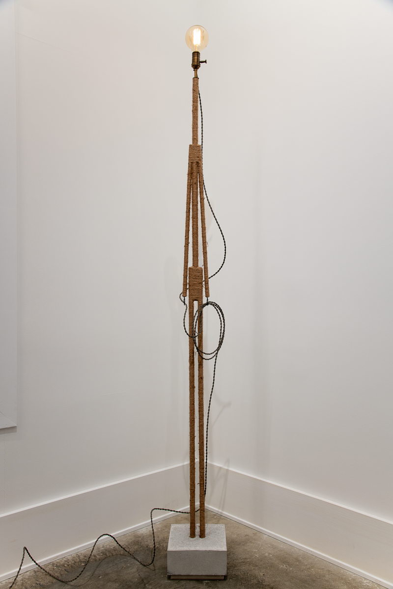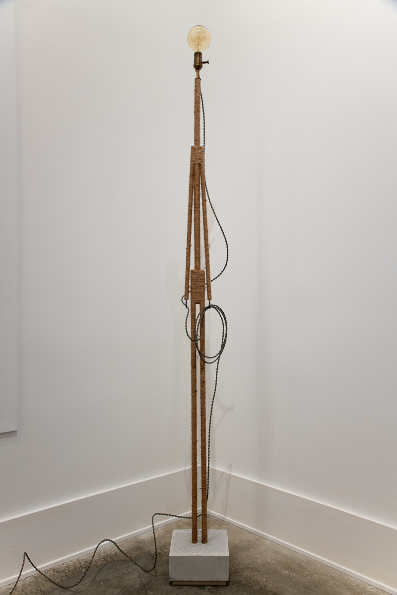 Materials:  wood, jute, glue, concrete, felt, twisted SPT-1 cloth-covered lamp cord, antiqued brass electrical components, dimmer electronics and a “squirrel cage” G30 Edison bulb.